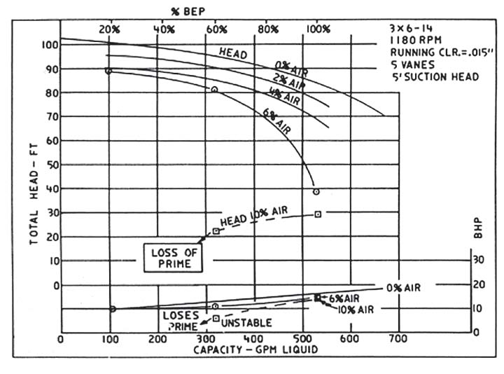 在氣體含量為 2% 左右的所有情況下,都需要對泵性能進行校正。可以處理 10% 以上的氣體濃度,但需要設計具有特定氣體處理特性的泵,例如渦流葉輪泵、側通道泵和再生渦輪泵。